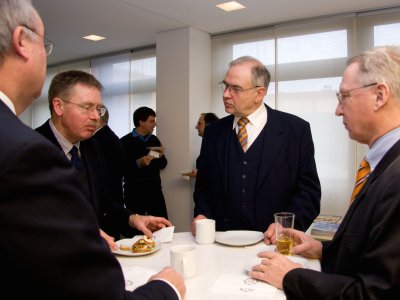 Smalltalk: Bezirksapostel Koberstein, Pfarrer Becke, Stammapostel Leber, Bezirksapostel i.R. Wend (von links nach rechts)