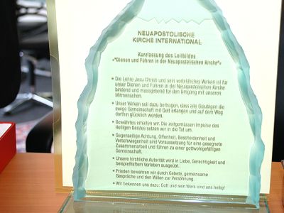 Den Schreibtisch des Stammapostels schmückt eine in Glas gravierte Kurzfassung des Leitbildes »Dienen und Führen«
