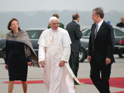 Benedikt XVI., der Bundespräsident (rechts) und seine Frau (links)